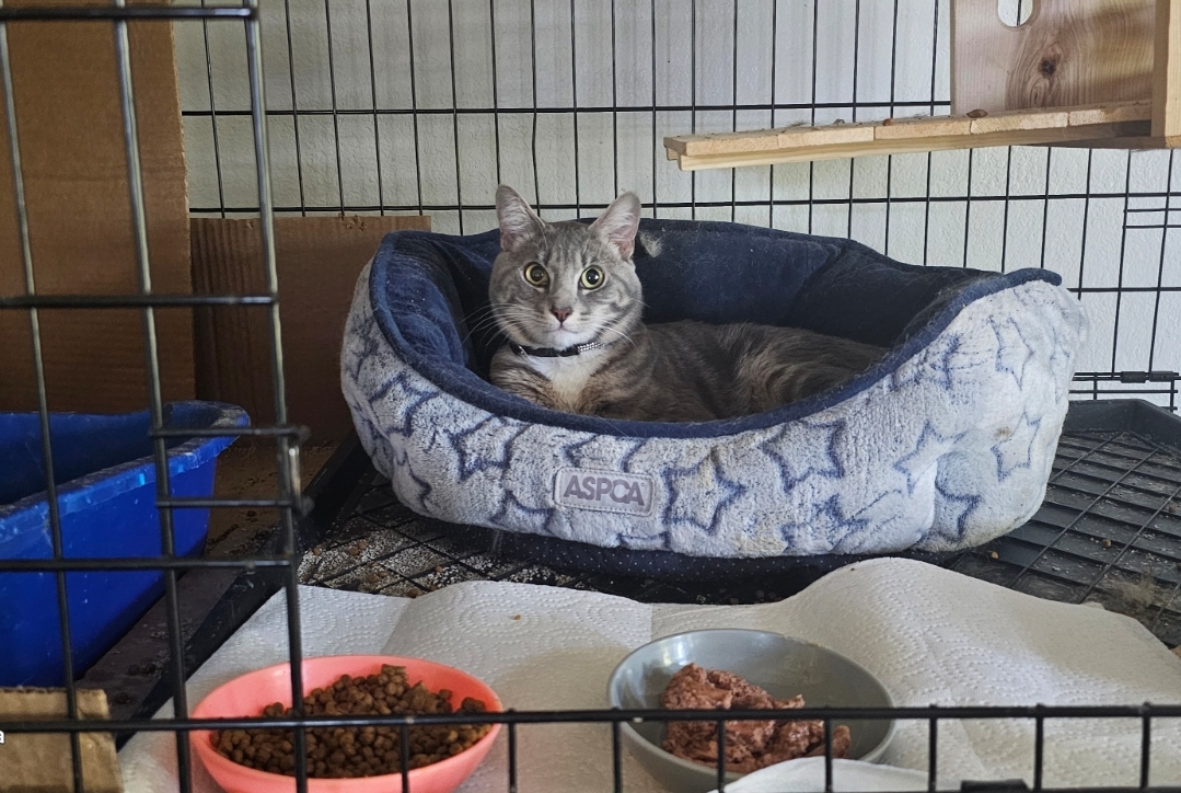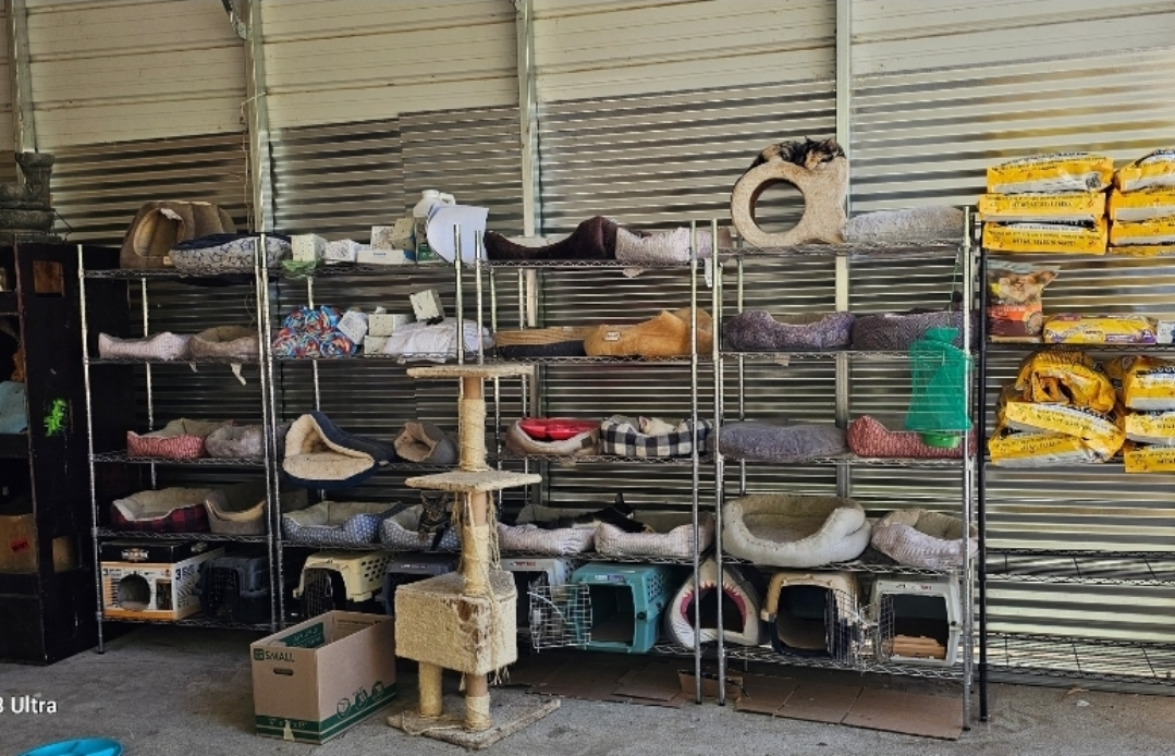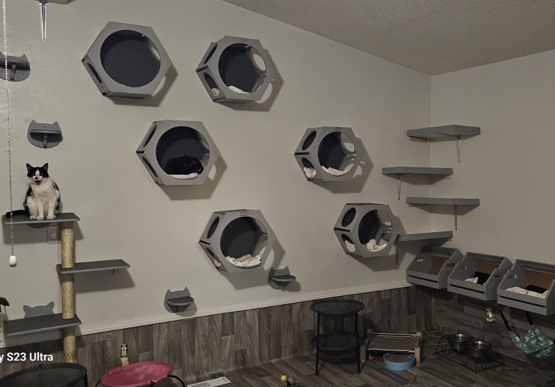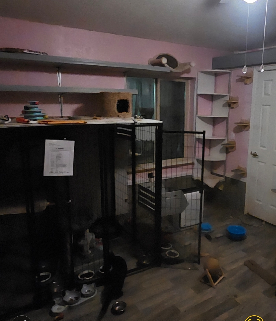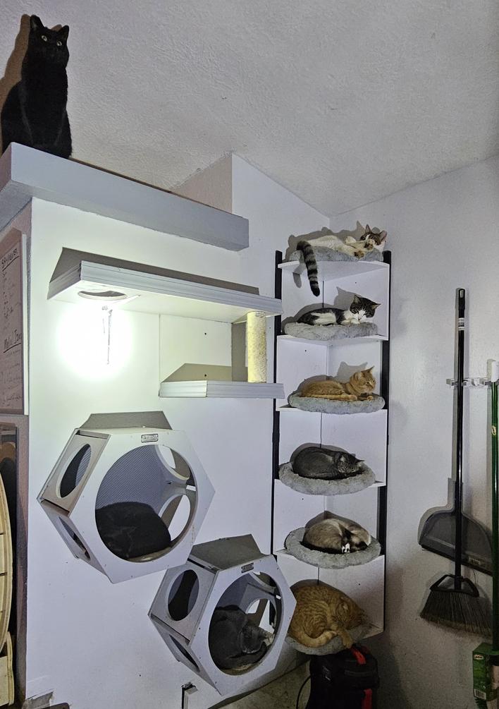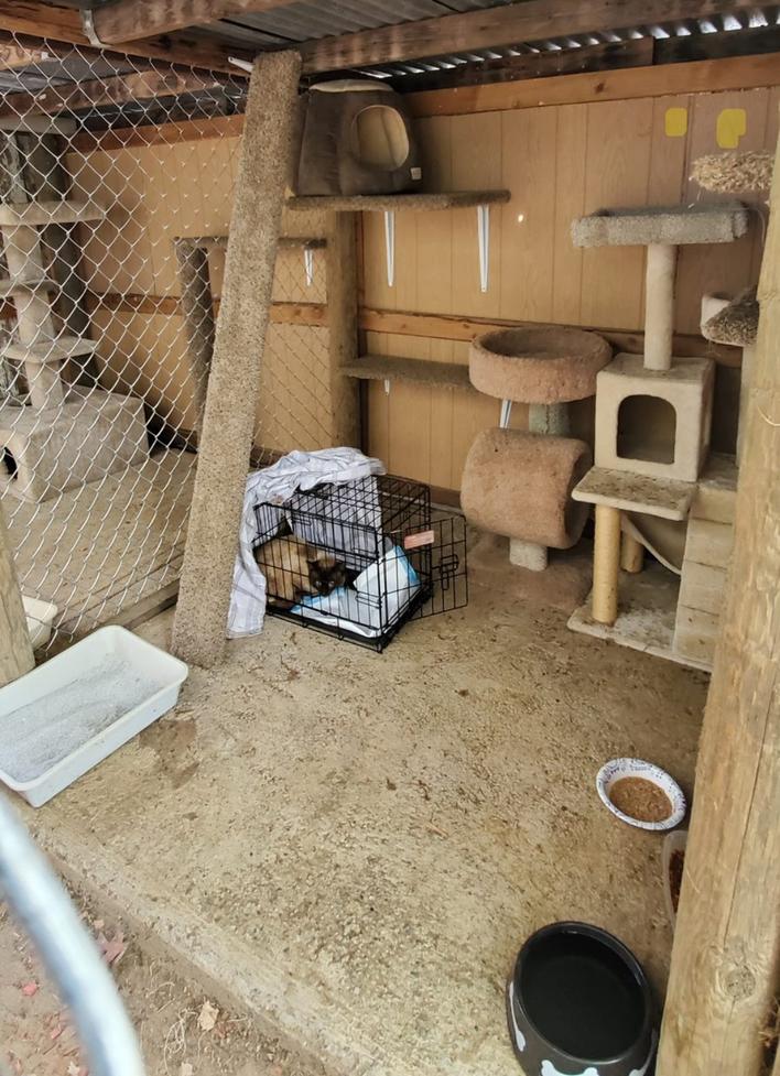 The cats are free to roam. There are cages here but they are for isolation to monitor the cats during intake, sickness, injury, aggression, and prior to Spay or Neuter surgery. Smaller cages are for transport. Isolation cages are large dog crates, 3 tier cat cage, and outdoor habitat.